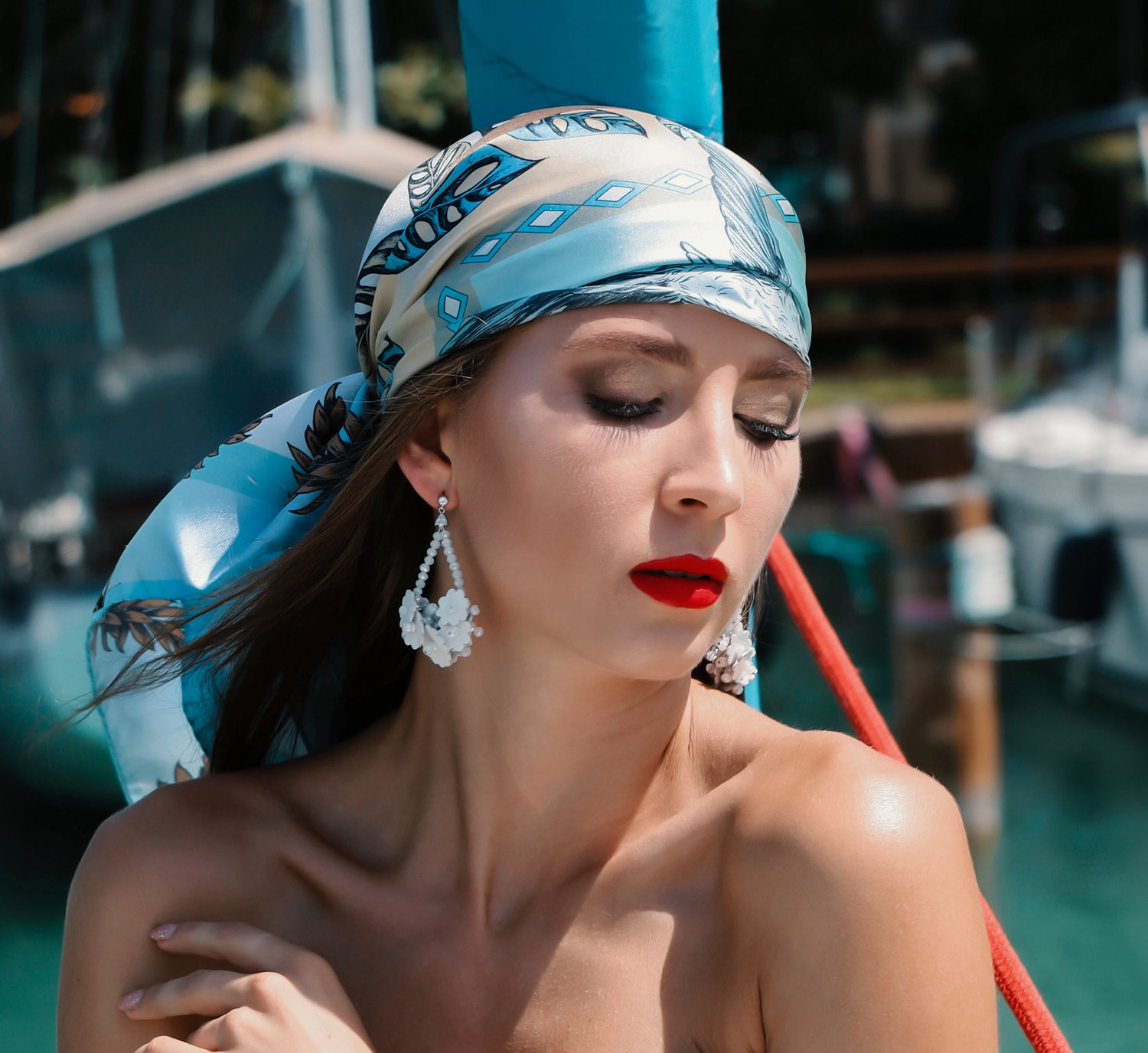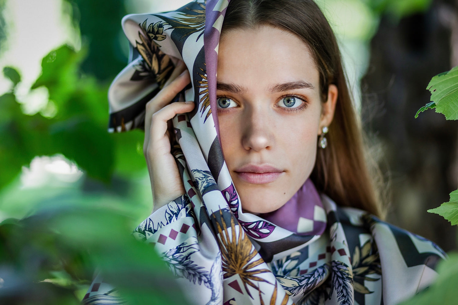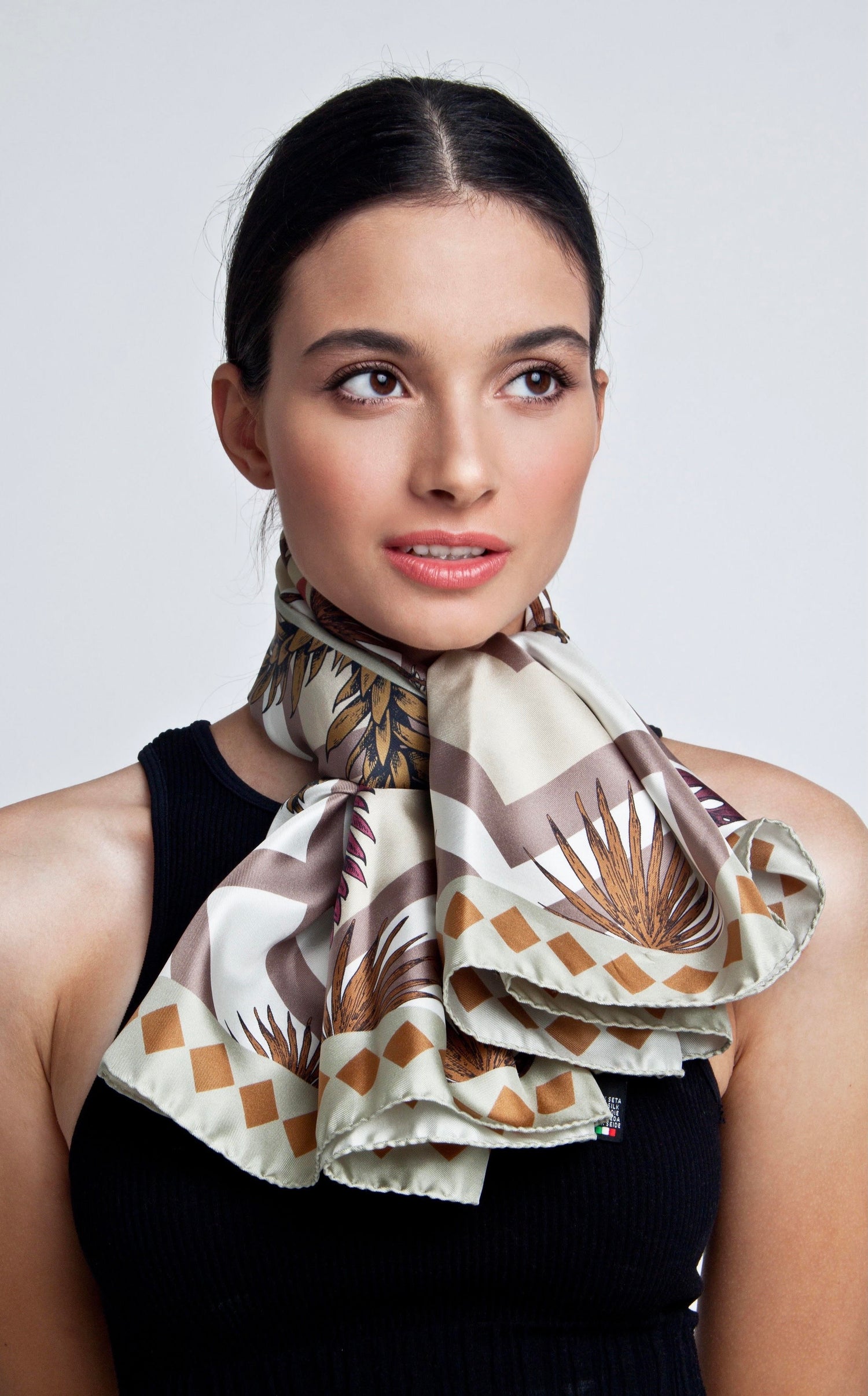 The concepts of silk accessories are created with free hand drawing and digital illustration, which are then manufactured in Como, Italy.